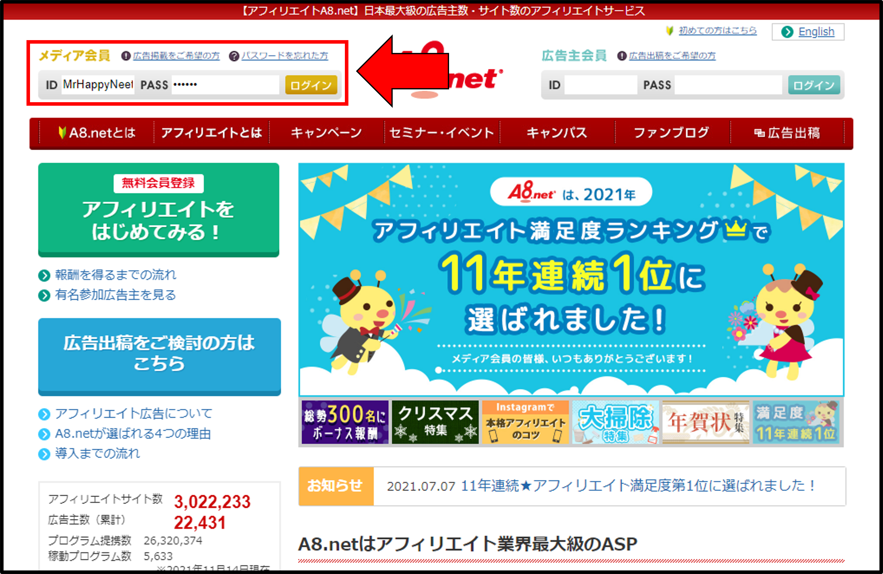 - A8.netのホーム画面を開き、画面左上のメディア会員ログインフォームに登録したID・パスワードを入力して「ログイン」を押下する