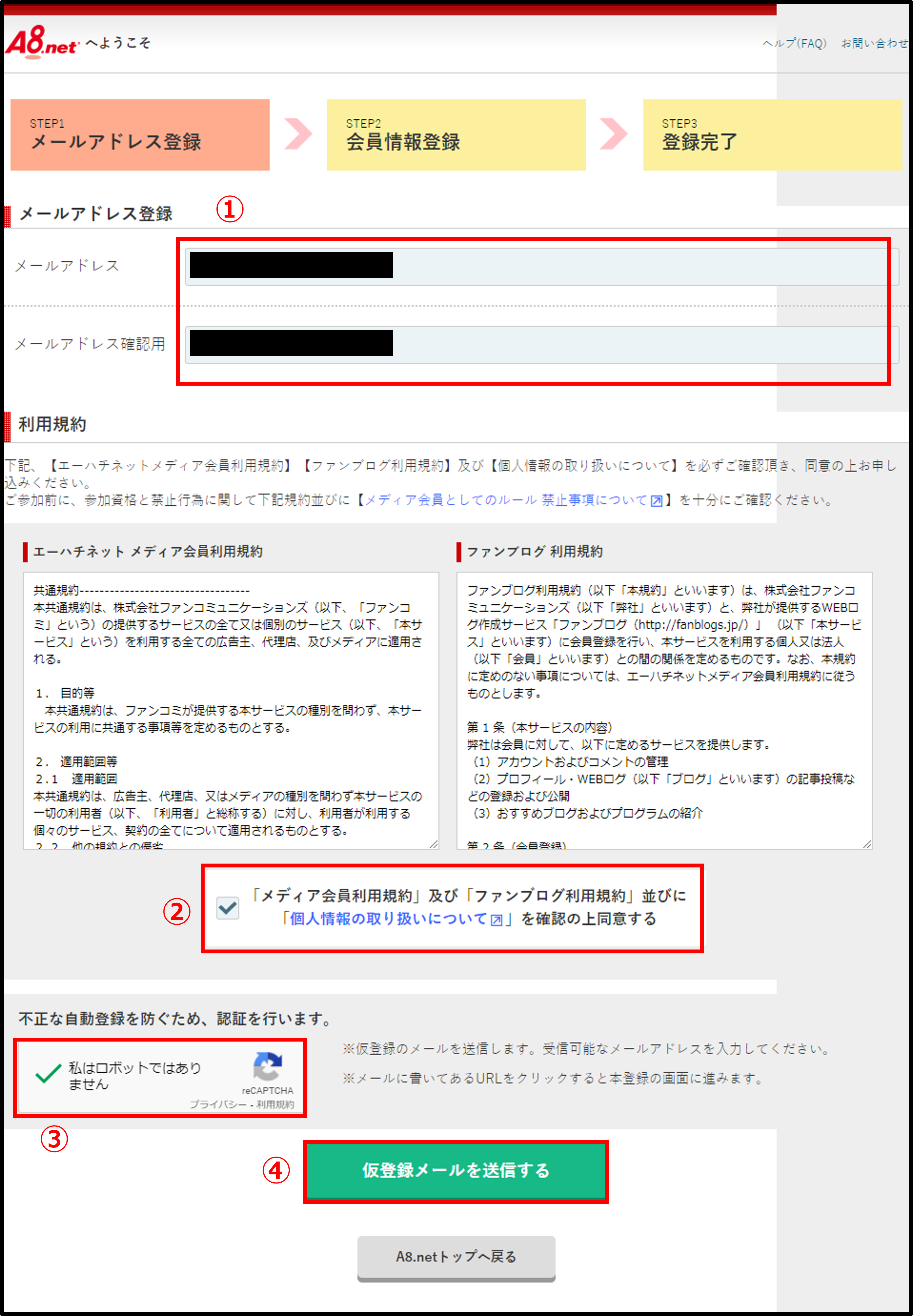 その後、不正な自動登録を防ぐためのチェック(③)をつけて、「仮登録メールを送信する」を押下(④)する
