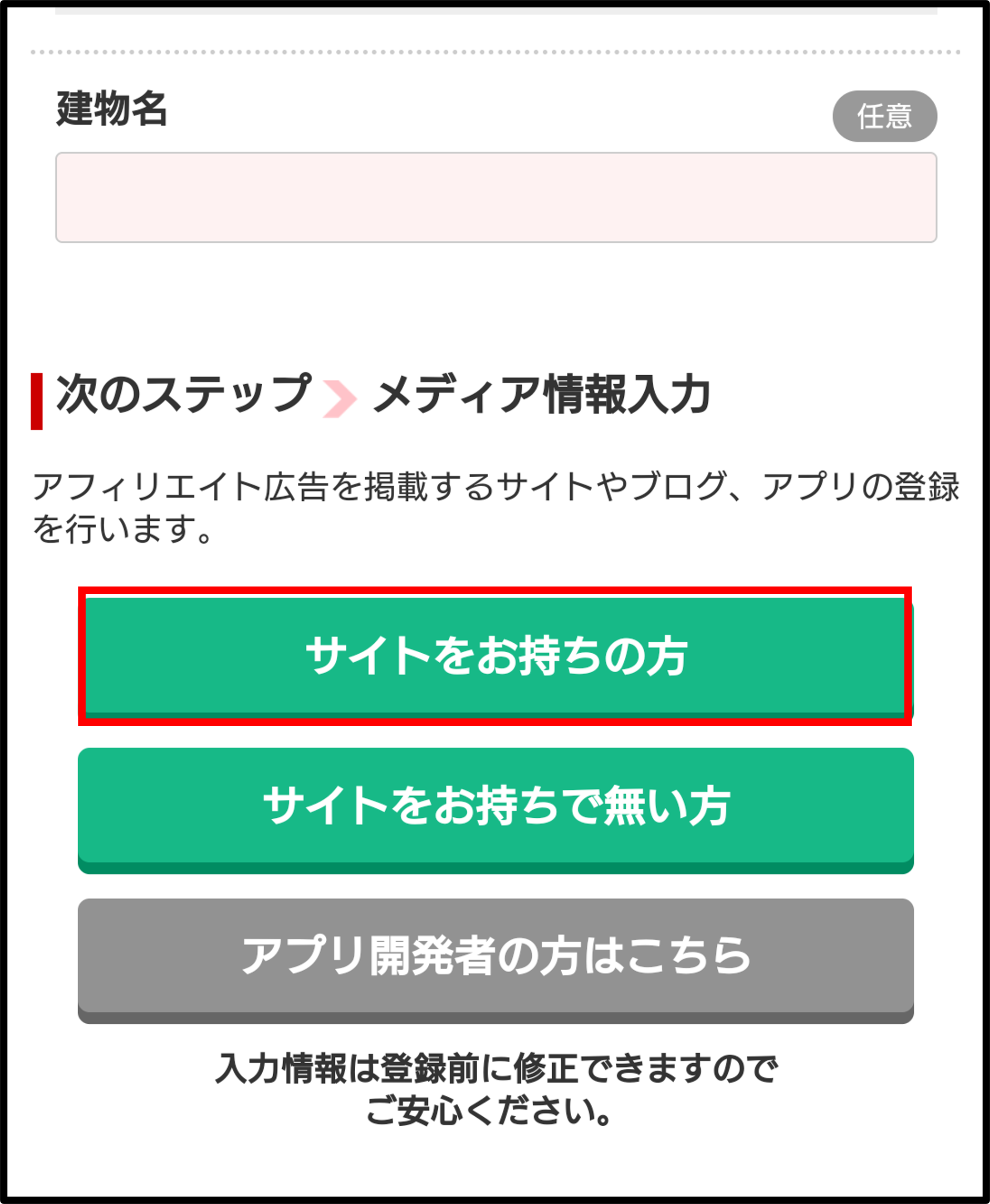 ※サイトを持っていない場合は「サイトをお持ちで無い方」を押下する