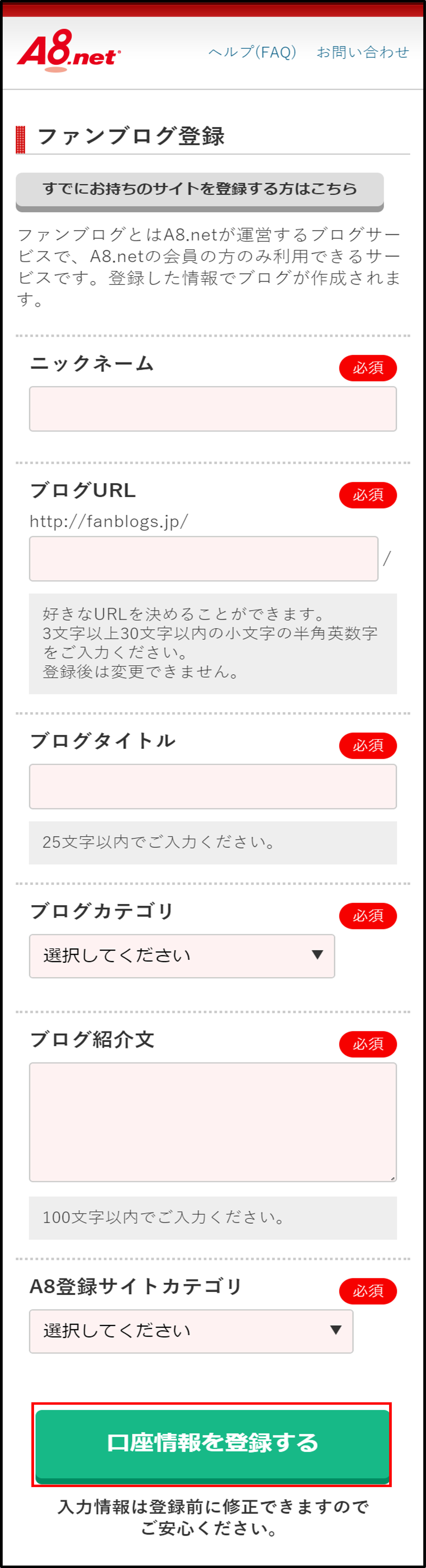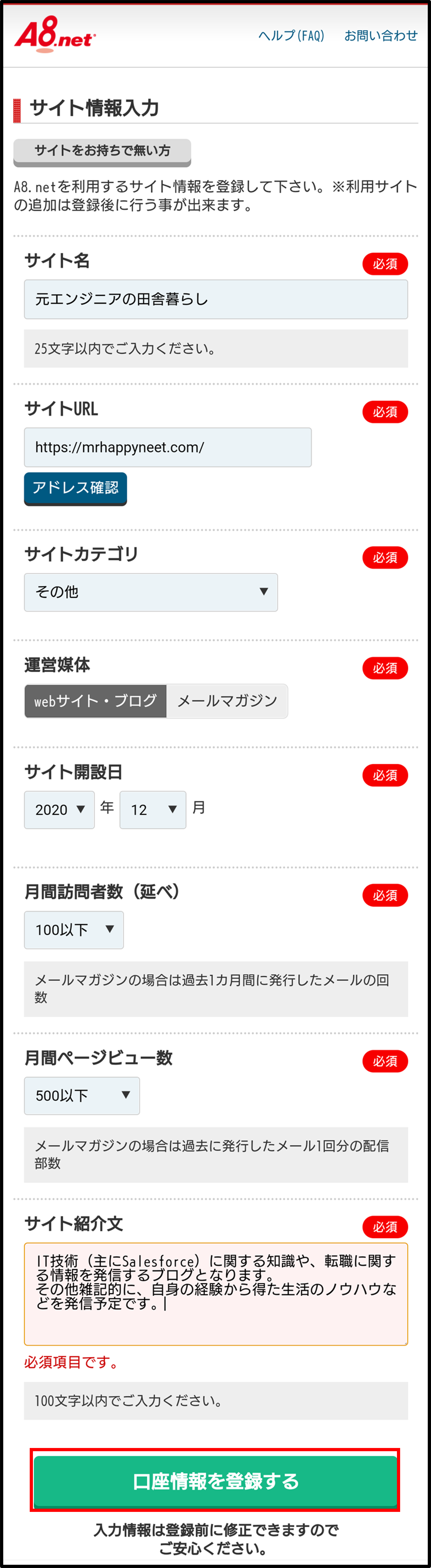 - (手順5で「サイトをお持ちの方」を押下した場合)自身のブログなどのサイト情報を入力し、「口座情報を登録する」を押下する