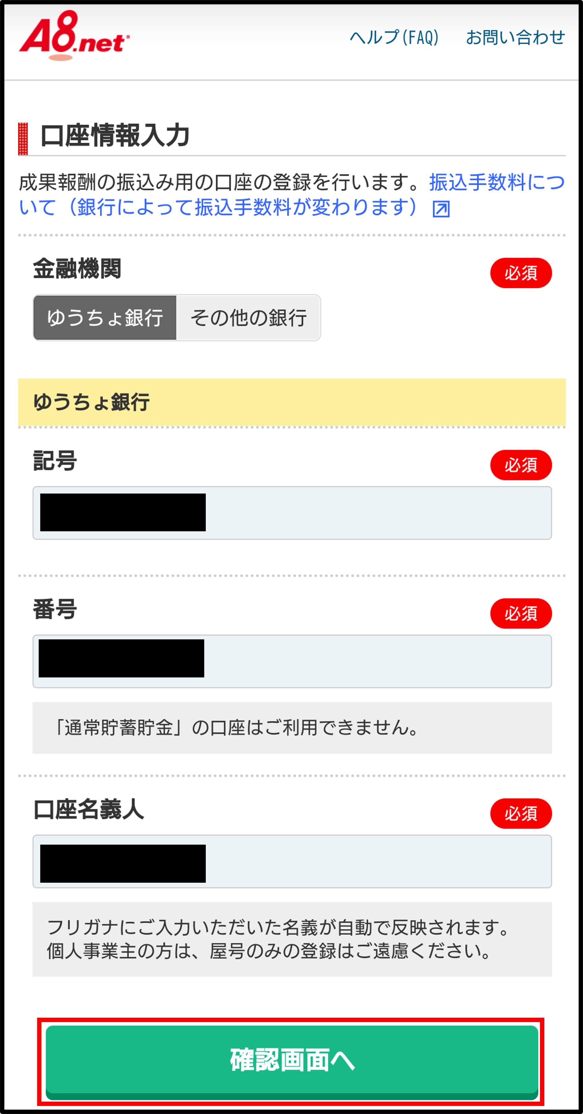 - 報酬が発生した際の振込先口座を入力し、「確認画面へ」を押下する