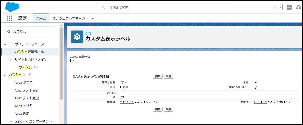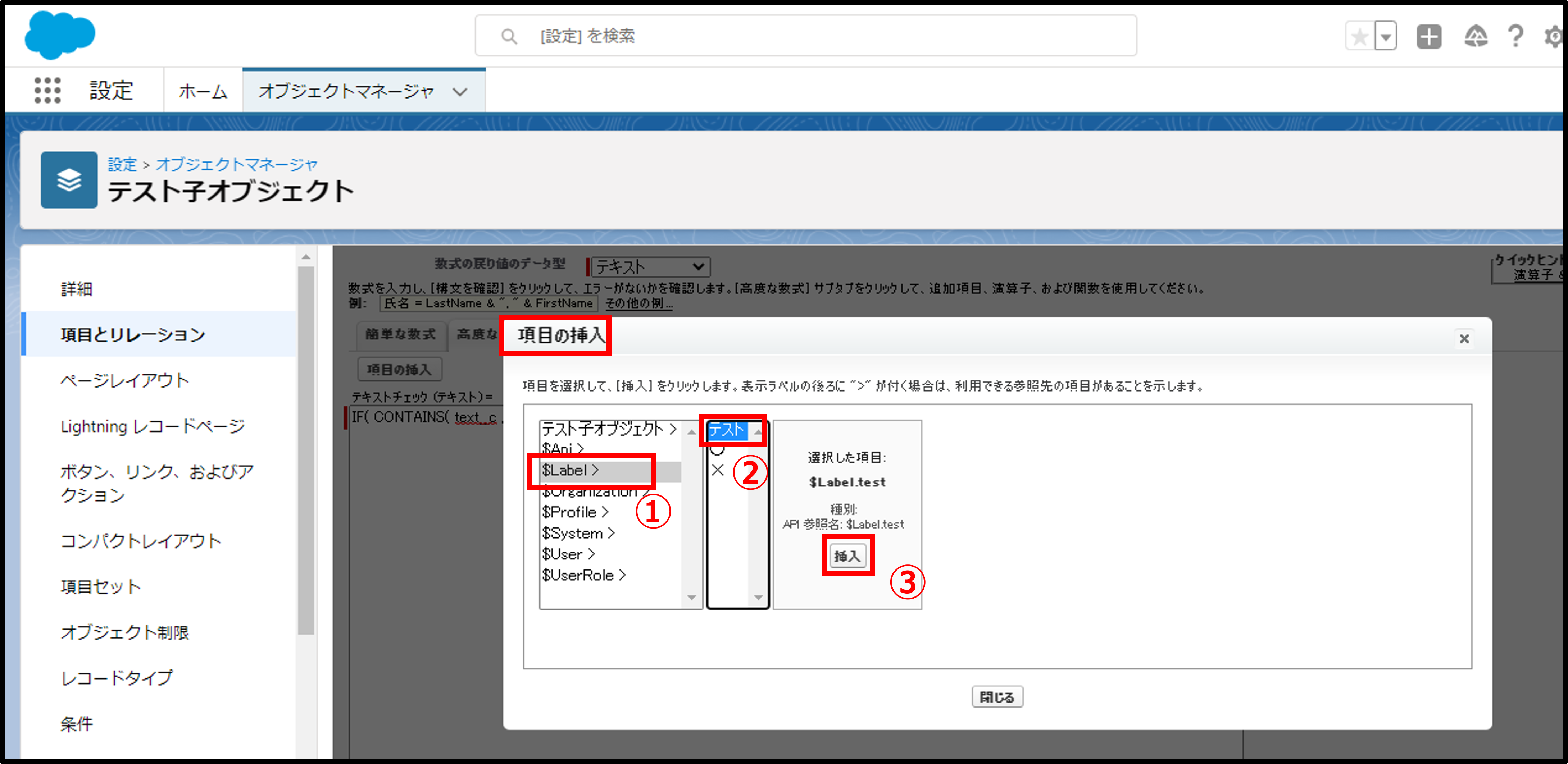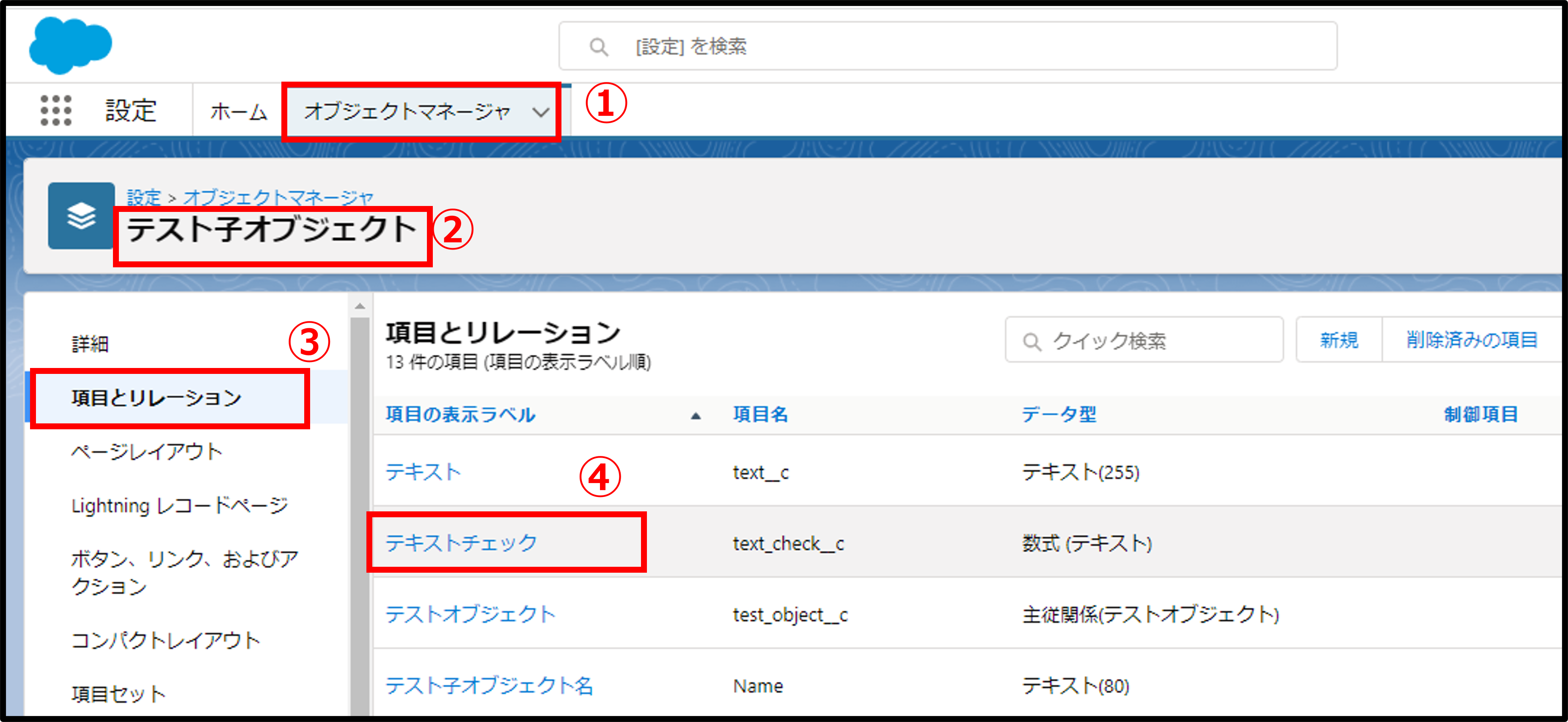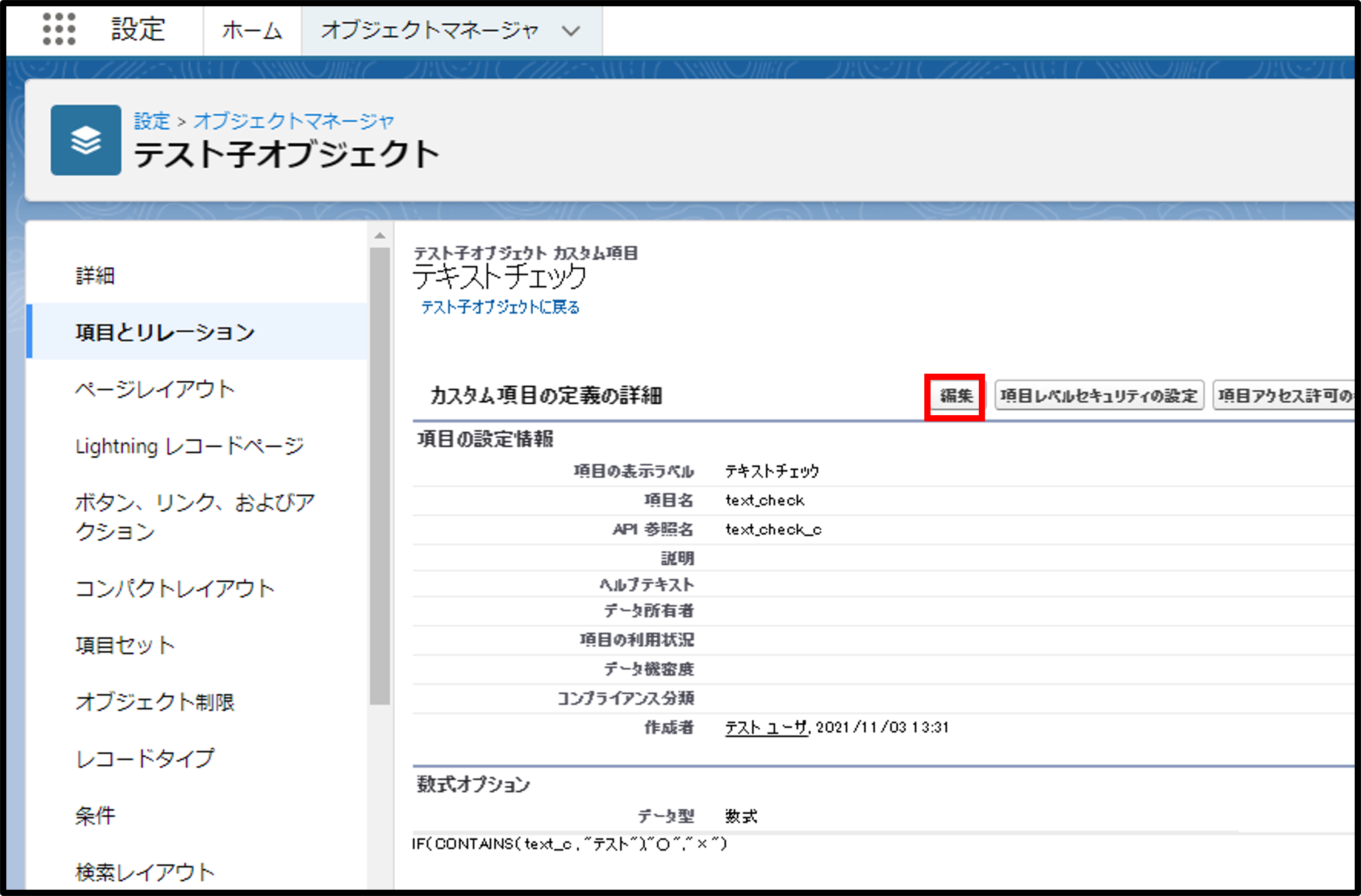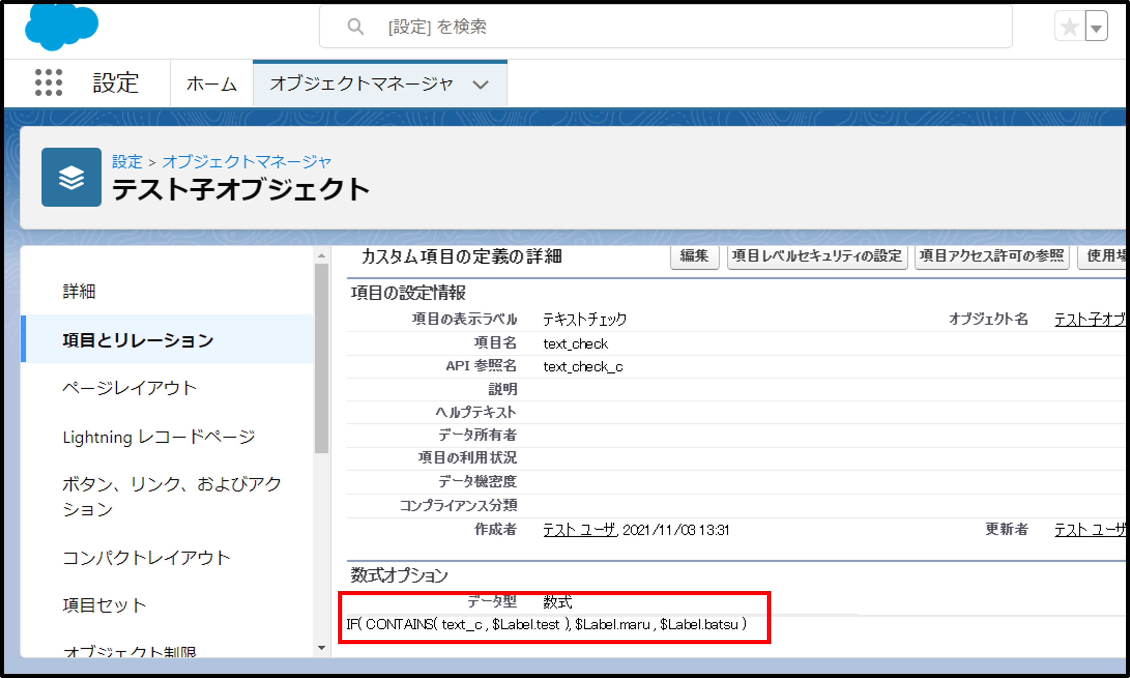 今回はカスタム表示ラベルを使用し、こちらの記事で作成した「テスト子オブジェクト」の数式項目「テキストチェック」の数式を修正します。