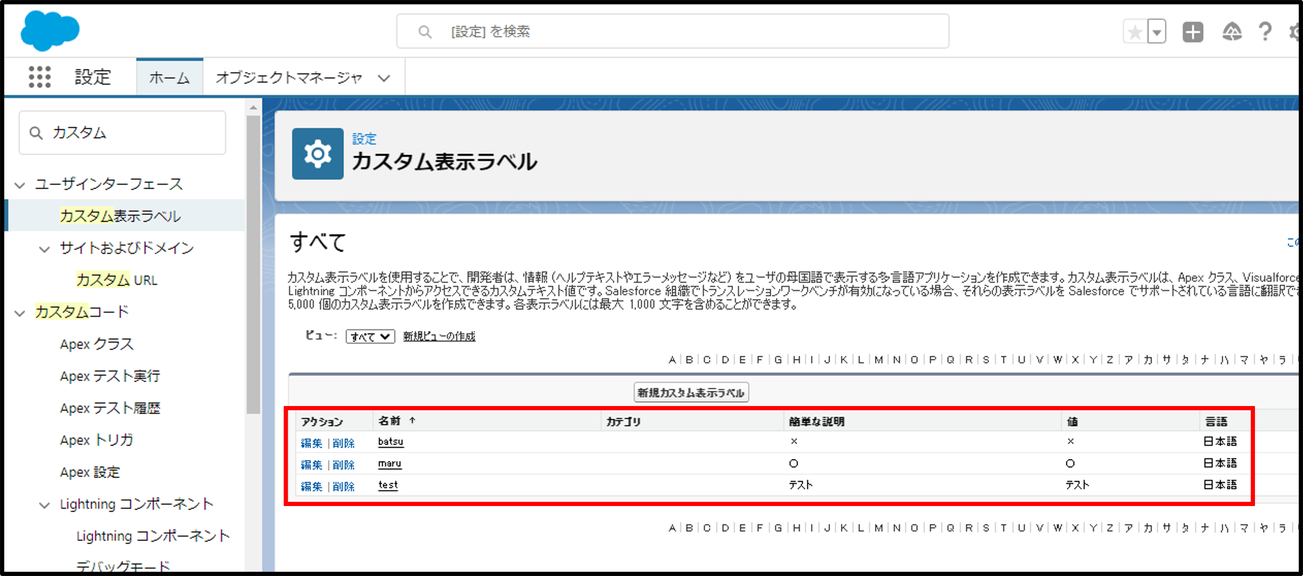 1. 設定のホームから「カスタム表示ラベル」を選択し、「新規カスタム表示ラベル」を押下する